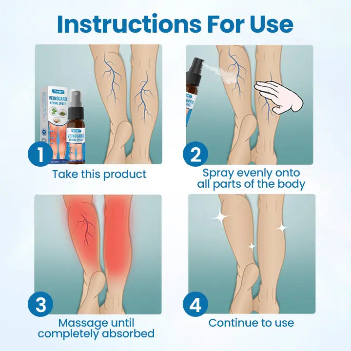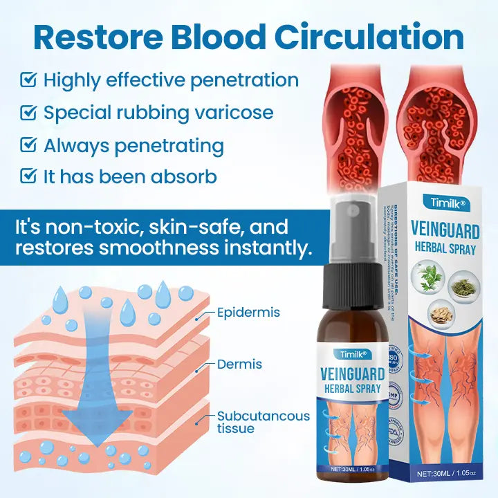 Timilk® VeinGuard Herbal Spray maakt gebruik van geavanceerde transdermale afgifte om actieve, plantaardige bestanddelen diep in de dermis te brengen, waar de microcirculatie is verstoord en beschadigde aderen zich bevinden. Klinisch ondersteund helpt het verzwakte aderen samen te laten vallen, zodat het lichaam ze op natuurlijke wijze kan afbreken—het verlicht zwelling en zichtbare uitstulpingen en verbetert de microcirculatie om het risico op bloedstagnatie te verminderen.